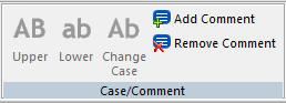 The Case/Comment group contains options for changing selected text to uppercase or lowercase. The Case/Comment group is unavailable when you access the Text Editor tab through the Embedded JavaScript or Embedded CSS view tabs, in the HTML canvas. The Case/Comment group is shown in the following image.