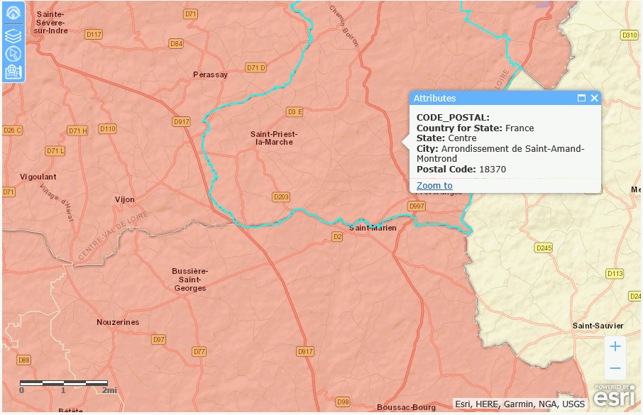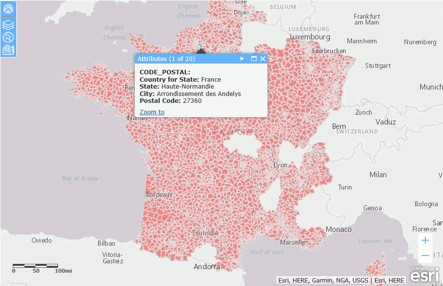 Run the HTML page. The output is shown in the following image, with one of the postal codes clicked to display the popup.