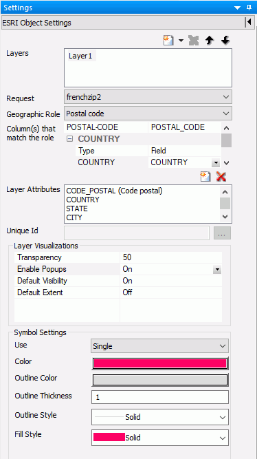 Configure the Server with a second level license. Create an HTML page, add an Esri component, and select the frenchzip2 request in the Requests & Data Sources panel. Then configure the Settings panel to use the request and the Postal code geographic role, as shown in the following image.