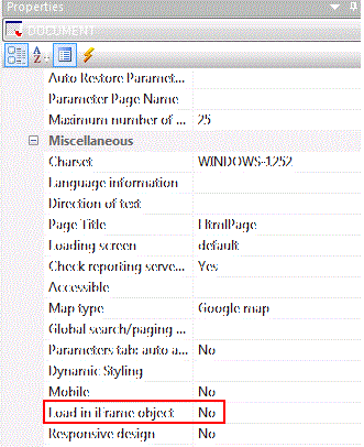 In order to run a map in the Business Intelligence Portal, you must configure the properties panel of the HTML page as shown in the following image.