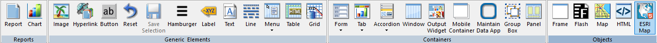 You insert an Esri map component in an HTML page by clicking the Esri Map button on the right end of the Objects group on the Components tab, as shown in the following image.