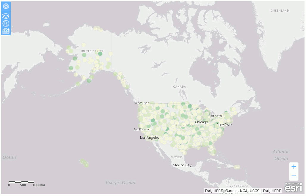 Number of Classes. User specifies the number of color breaks. The default is 5. Color Scheme. User selects the color palette for the markers. The default uses shades of green. For more information, see Configuring Point Symbology Using Color. |