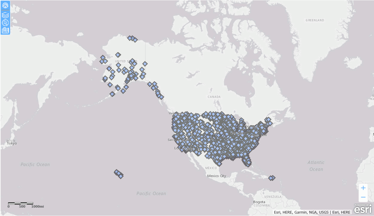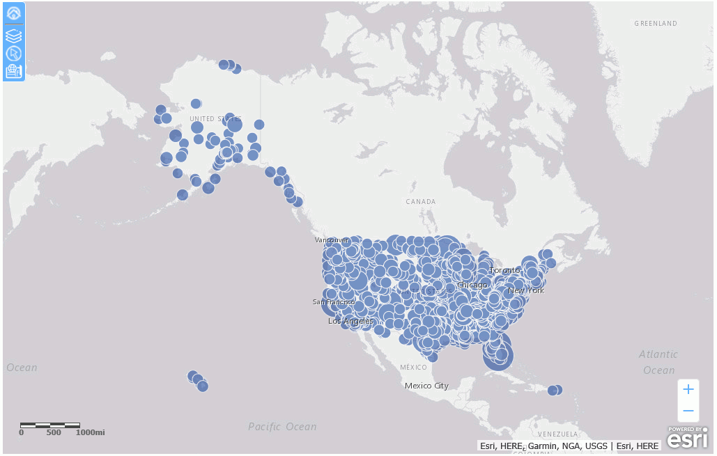 The WebFOCUS request that provides the values is customer_locations.fex, described in Configuring a Map Layer. Run the HTML page. The output is shown in the following image.