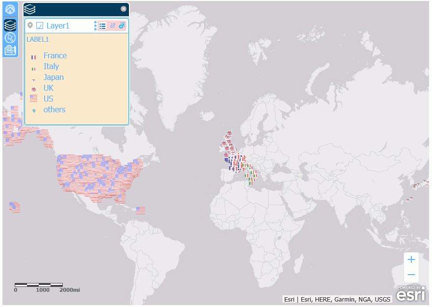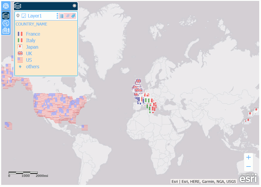 Configure the map to use the customer_locations2 procedure and the Point of Interest geographic role in the ESRI Object Settings panel. Configure the unique symbology to use the COUNTRY_NAME field, as shown in the following image.