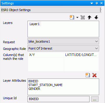 Add this request to the HTML page using the Requests & Data Sources panel. Then configure the ESRI Object Settings panel to use this request for the Customer layer. Configure the symbol settings by selecting the appropriate fields from the request, as shown in the following image.