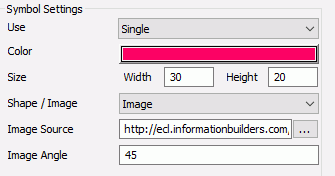 Use. Selects the type of symbols, Single for this option. Color. N/A. The image has its own colors. Size. User specifies the marker width and height in pixels. The default is 12 for each, and the maximum is 99. Shape/Image. Select Image for this option. Image Source. User must provide the path to the image. Image Angle. User can enter an angle, in degrees, to control the image orientation. For more information, see Configuring Point Symbology Using a Single Image File. |
