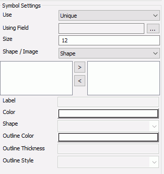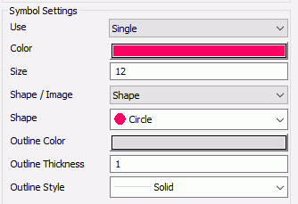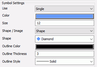Use. Selects the type of symbols, Single for this option. Color. User selects a marker color. The default is red. Size. User specifies the marker size in pixels. The default is 12 and the maximum is 99. Shape/Image. Select Shape for this option. Shape. User selects one of the following marker shapes: