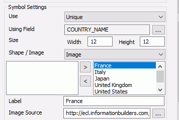 Use. Selects the type of symbols, Unique for this option. Using Field. User selects an alphanumeric dimension in the request and assigns marker properties for each value. Size. User specifies a size in pixels for the markers, for a standard shape. For an image, the user specifies the width and height in pixels. The default is 12 and the maximum is 99. Shape / Image. User can select a standard shape or specify an image source for the markers. Dimension Values box. A box is populated with the dimension values. The user can select values and move them to the right, then assign marker properties to those selected values. Label. User specifies text to display in the legend for each selected dimension value. Color. If Single is the selected marker type, the user selects a color for each selected dimension value. Shape. If Shape is the selected marker type, the user selects a standard shape and standard shape properties for each selected dimension value. Image Source. If Image is the selected marker type, the user specifies an image source for each selected dimension value. For more information, see Configuring Unique Symbology for Points. |