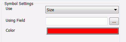 Use. Selects the type of symbols, Size for this option. Using Field. User selects a field in the request to be used to classify the markers by size. Color. User selects a color for the markers. For more information, see Configuring Point Symbology Using Size. |