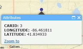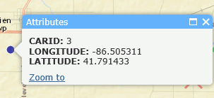 Clicking a marker opens its InfoWindow. The values displayed in the InfoWindow update as the marker moves. The following images show an open InfoWindow for the same marker in two different locations.