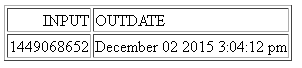DEFINE FILE GGSALES INPUT/I9=1449068652; OUTDATE/HMTDYYSb = UNIX2GMT(INPUT); END TABLE FILE GGSALES PRINT DATE NOPRINT INPUT OUTDATE WHERE RECORDLIMIT EQ 1 ON TABLE SET PAGE NOLEAD END