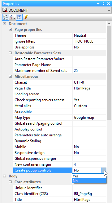 • Before adding controls to the page, open the Properties panel. For the DOCUMENT object, set the Create popup controls property to Yes.