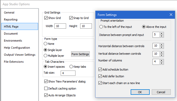 Note: Start each chain on a new line is turned on, by default. This option can be found in the Form Settings dialog box, in the HTML Page section of the App Studio Options dialog box, as shown in the following image.