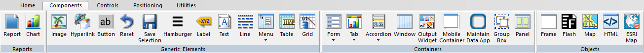The Components tab contains the Reports, Generic Elements, Containers, and Objects groups, as shown in the following image.