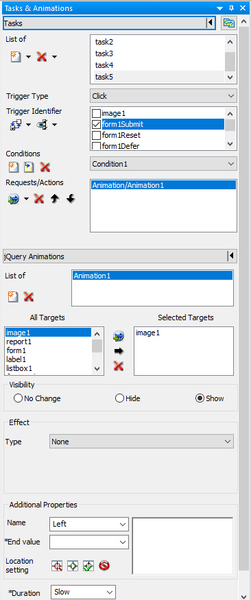 The Tasks section of the Tasks & Animations panel allows you to execute a request when specific criteria are met. For example, you can create a task that runs an embedded report when a button is clicked.