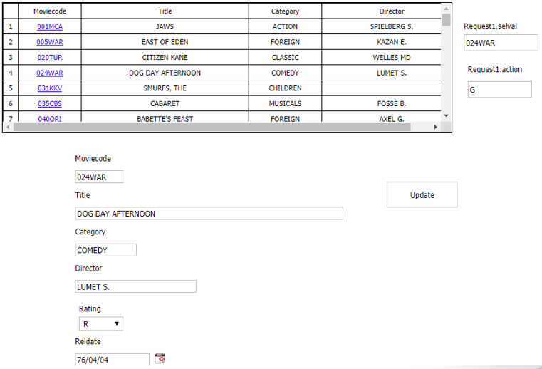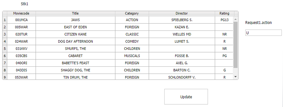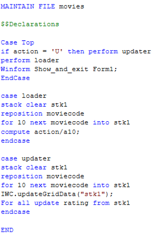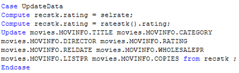 5. Open the Maintain Data code and add an UpdateData case with a test for action equal to 'U', as shown in the following image. The edit boxes and stacks get sent back to the code.