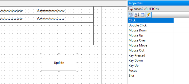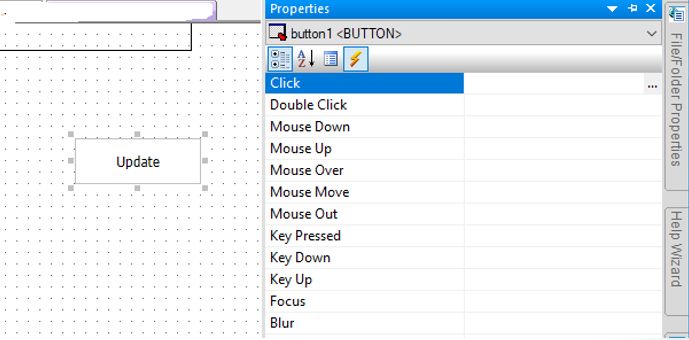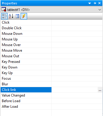 15. Open the Properties panel, click the lightning bolt, and double-click Click, as shown in the following image.