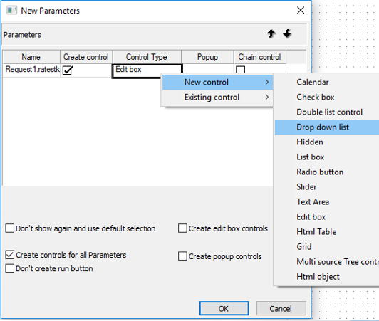 5. Right-click the Edit box value in the Control Type column, select New control, and then select Drop down list, as shown in the following image.
