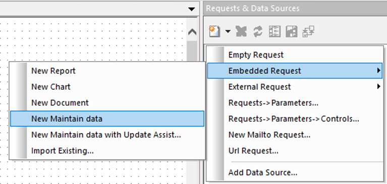 1. From the Requests & Data Sources panel, click the down arrow next to the New icon, select Embedded Request, and then select New Maintain data, as shown in the following image.