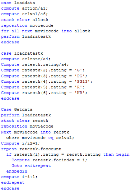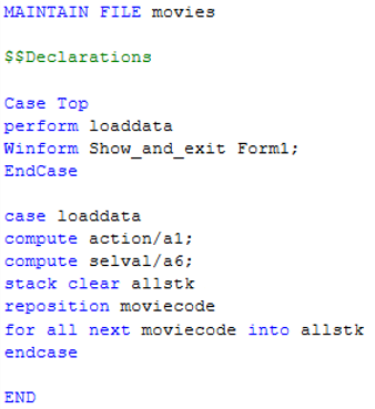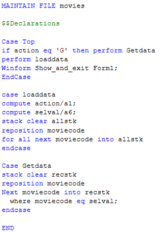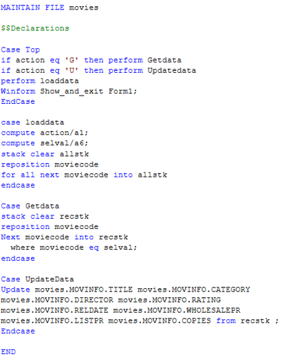 • Set action to 'G', as shown in the following code, to branch in the Maintain Data code.