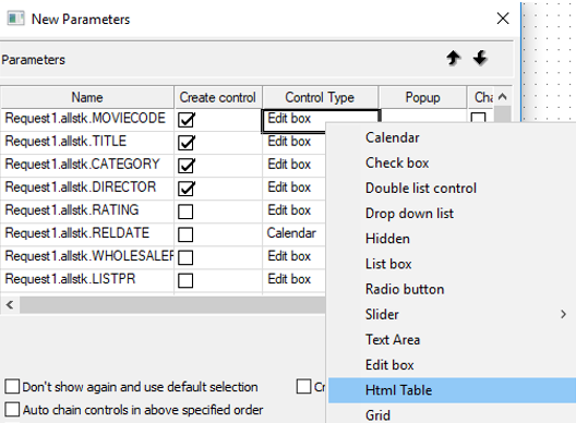 5. Right-click the Edit box value in the Control Type column on row 1 and select Html Table.