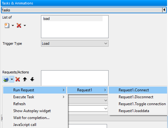3. In the Requests/Actions section, click the arrow for Requests selections, select Run Request, then select Request1, and then select Request1.Connect, as shown in the following image.
