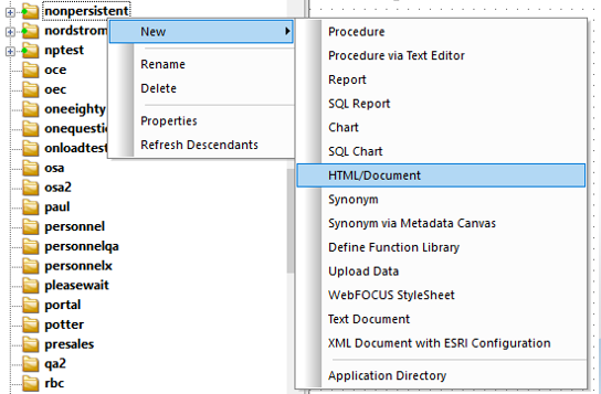 1. From the Environments Tree panel, right-click an application folder, point to New, and click HTML/Document, as shown in the following image. If needed, create the domain first.