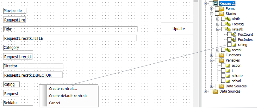 4. From the Requests & Data Sources panel, right-click ratestk/rating, drag it onto the form next to the rating field, and select Create controls, as shown in the following image.