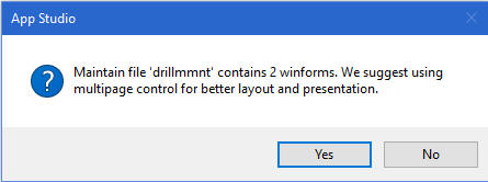 As the migration runs, you may receive a message that the Maintain procedure contains multiple Winforms and that recommends that you use a multipage control for better layout and presentation, as shown in the following image. The multipage control puts one Winform on a page and the appropriate Winform is displayed automatically when needed.