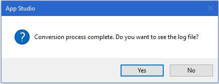 If the conversion is successful, the following WebFOCUS App Studio dialog box opens, indicating that the conversion process is complete and asking if you want to see the log file.