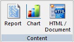 The Content group contains the components or tools that you can use to create an application. These include: Report, Chart, and HTML/Document. The Content group is shown in the following image.
