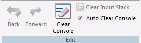 The Edit group allows you to load commands, clear the console, and clear the input stack. The input stack is a series of commands that you enter using the Command console. The Edit group is shown in the following image.