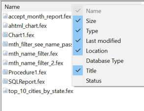 Note: To sort content in the Environments Detail panel, you do not use the View Options command. Instead, you would click the columns at the top of the Details pane to sort content by name, size, type, last modified, or location.