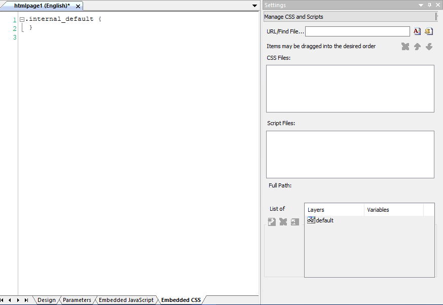 The Embedded JavaScript and Embedded CSS View tabs are accessible when you are creating an HTML page. From here, you can create JavaScript code and cascading style sheets (CSS) for use in your HTML page. You can reference existing cascading style sheet files and JavaScript files by typing the URL in the URL/Find File area of the Settings panel. You can also search for these files by using the CSS or JavaScript commands.