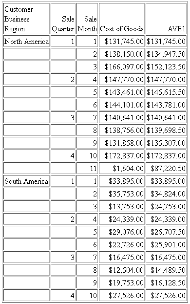 TABLE FILE WF_RETAIL_LITE SUM COGS_US COMPUTE AVE1/D12.2M = PARTITION_AGGR(COGS_US, TIME_QTR, -1, C, AVE); BY BUSINESS_REGION BY TIME_QTR BY TIME_MTH WHERE BUSINESS_REGION EQ 'North America' OR 'South America' ON TABLE SET PAGE NOLEAD END