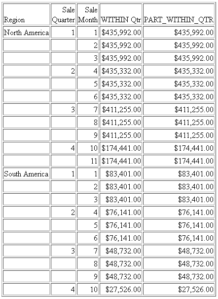 TABLE FILE WF_RETAIL_LITE SUM COGS_US WITHIN TIME_QTR AS 'WITHIN Qtr' COMPUTE PART_WITHIN_QTR/D12.2M = PARTITION_AGGR(COGS_US, TIME_QTR, B, E, SUM); BY BUSINESS_REGION AS Region BY TIME_QTR BY TIME_MTH WHERE BUSINESS_REGION EQ 'North America' OR 'South America' ON TABLE SET PAGE NOPAGE END
