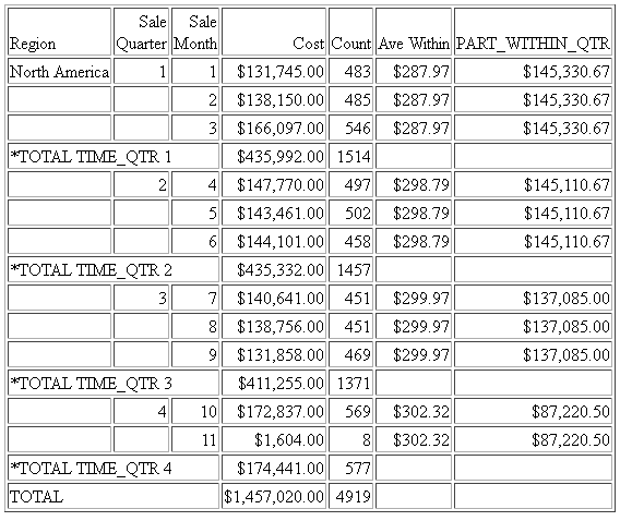 TABLE FILE WF_RETAIL_LITE SUM COGS_US AS Cost CNT.COGS_US AS Count AVE.COGS_US WITHIN TIME_QTR AS 'Ave Within' COMPUTE PART_WITHIN_QTR/D12.2M = PARTITION_AGGR(COGS_US, TIME_QTR, B, E, AVE); BY BUSINESS_REGION AS Region BY TIME_QTR ON TIME_QTR SUBTOTAL COGS_US CNT.COGS_US BY TIME_MTH WHERE BUSINESS_REGION EQ 'North America' ON TABLE SET PAGE NOPAGE END