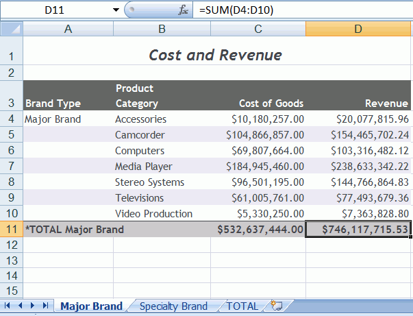 TABLE FILE WF_RETAIL HEADING "Cost and Revenue" SUM COGS_US REVENUE_US BY BRANDTYPE BY PRODUCT_CATEGORY ON TABLE SUBTOTAL ON TABLE PCHOLD FORMAT XLSX FORMULA BYTOC END
