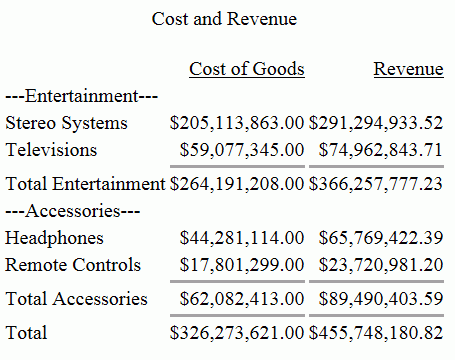 TABLE FILE WF_RETAIL_SALES HEADING CENTER "Cost and Revenue" " " SUM COGS_US REVENUE_US FOR ID_PRODUCT "Entertainment:" OVER '2001' TO '2167' AS 'Stereo Systems' LABEL SS OVER '4012' TO '4018' AS 'Televisions' LABEL TV OVER BAR OVER RECAP TOTENT=SS + TV; AS 'Total Entertainment' OVER "Accessories:" OVER '5001' TO '5007' AS 'Headphones' LABEL HP OVER '5008' TO '5009' AS 'Remote Controls' LABEL RC OVER BAR OVER RECAP TOTACC=HP+RC; AS 'Total Accessories' OVER BAR OVER RECAP TOTAL=TOTENT+TOTACC; AS 'Total' ON TABLE NOTOTAL ON TABLE SET STYLE * INCLUDE = IBFS:/FILE/IBI_HTML_DIR/javaassist/intl/EN/combine_templates/ENblack_theme.sty, $ ENDSTYLE END