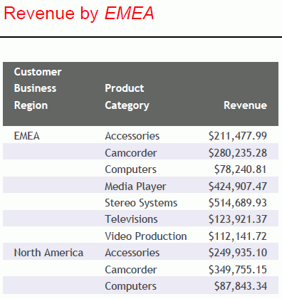 The output is shown in the following image. Note that the Accessories product category is omitted from the report because of the subquery.