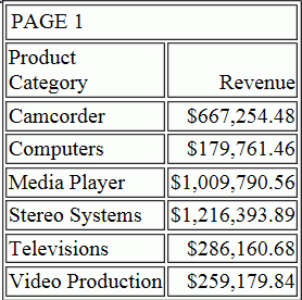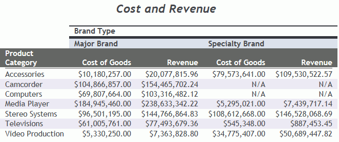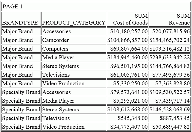 The following image shows a tabular report, which displays cost of goods and revenue sorted across brand types and by product category, creating a matrix report. When you include both BY and ACROSS sort phrases in a report request, information is sorted vertically and horizontally, turning the report into a matrix of information that you read like a grid. A matrix report can have multiple BY and ACROSS sort fields.