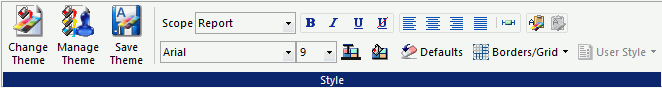 You use the Report Properties group to control report properties. The Report Properties group is shown in the following image.