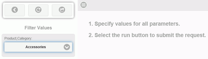 In the example shown in the following image, there is one filter for Product Category, appearing in the Filter Values area. Using the drop-down arrow in the Product Category field, select the product category that you want to see. Accessories is the selected value in the following image.