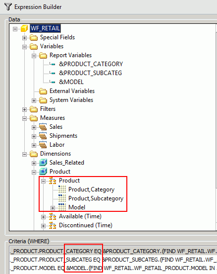 In the example below, we use the Category, Subcategory, and Model fields from the Product dimension of the WF_RETAIL database.