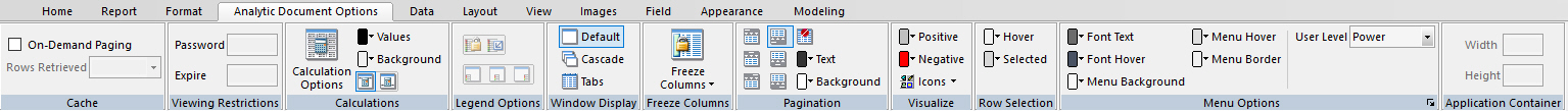 Sets the width and height of FLEX or APDF formatted Analytic Documents. The Application Container group is shown in the following image.