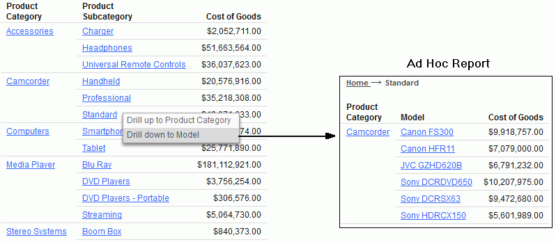 In the following example, the user clicked the Standard subcategory under the Camcorder category. From the resulting menu, the user selected Drill down to Model. An ad hoc report was generated, shown on the right. The source passed the camcorder and standard parameters to the target, which shows those parameters only, down to the model level.