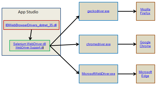 The first tier is a TIBCO browser dll (IBIWebBrowserDrivers_dotnet_35.dll). This acts a bridge between WebFOCUS App Studio and the second tier Selenium Web drivers (WebDriver.dll and Webdriver.Support.dll). The Selenium drivers communicate with the browsers through the third tier.