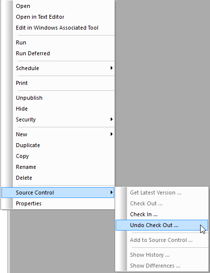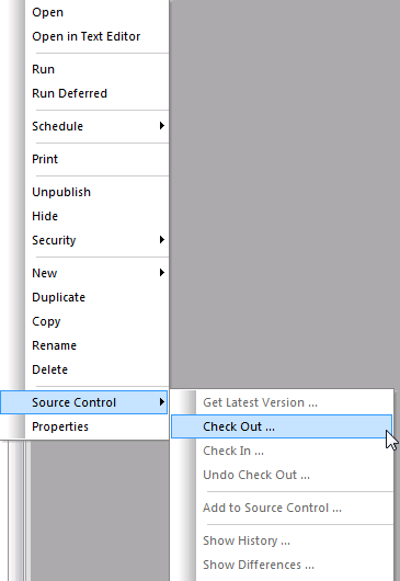 Note: If the Check Out option is not available from the shortcut menu, it means that another user has checked out the file. To verify this, open the File/Folders Properties panel. The Source Control Status property value is Checked out by <user name>.