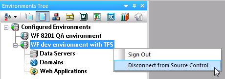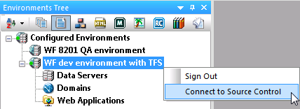 The following image shows an example of Source Control icons for added and checked out folders and files in the Configured Environments tree.