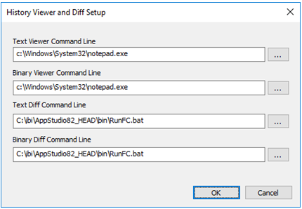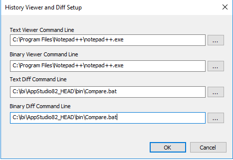 Opens the History Viewer and Diff Setup dialog box, which enables you to configure the editor and application used as a Compare tool. This dialog box includes edit input controls for specifying the following: